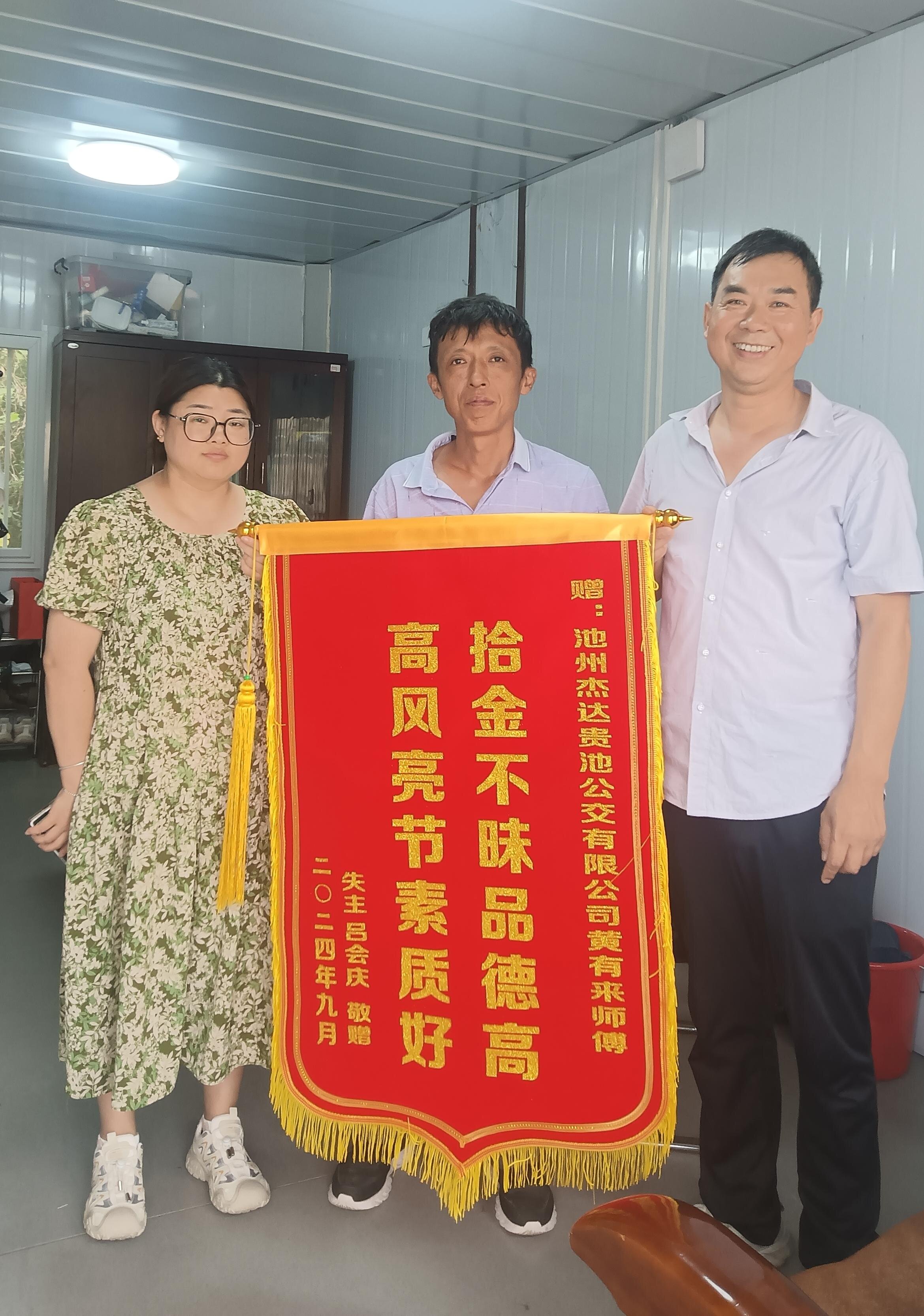 2024年9月12日下午,池州杰達(dá)貴池公交公司收到了來自上海呂會(huì)慶先生委托其朋友送來的一面錦旗。經(jīng)了解,2024年9月9日下午,公交駕駛員黃有來師傅在執(zhí)行完花廟至貴池的班次任務(wù)車輛入庫后,在打掃衛(wèi)生時(shí)發(fā)現(xiàn)后座上有一手提袋,外面散落了大量現(xiàn)金,黃有來師傅即刻將手提袋及現(xiàn)金交到調(diào)度室。失主在收到丟失物品后非常激動(dòng),送來錦旗以表謝意。黃有來作為一名普通的公交駕駛員,在崗位上展現(xiàn)出拾金不昧的精神,不僅體現(xiàn)了個(gè)人高尚的道德品質(zhì)和社會(huì)責(zé)任感,也傳遞了社會(huì)正能量。