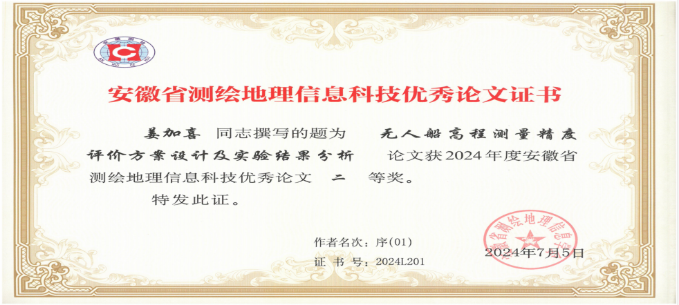 集團所屬設(shè)計總院姜加喜、舒江洲同志撰寫的論文《無人船高程測量精度評價方案設(shè)計及實驗結(jié)果分析》獲2024年度安徽省測繪地理信息學(xué)會測繪地理信息科技優(yōu)秀論文二等獎。