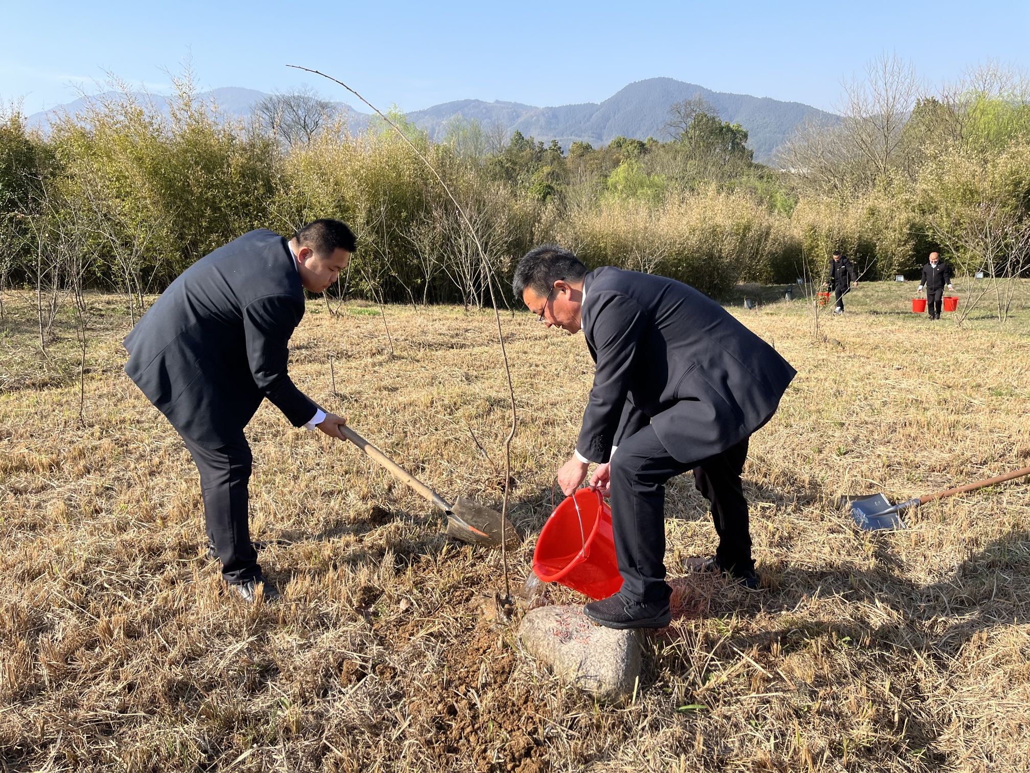 植樹現(xiàn)場,大家干勁十足,熱情洋溢,分工明確,密切配合:有的揮鋤挖坑,有的扶苗培土,有的運水澆水……畫面溫馨積極,處處都是忙碌的身影