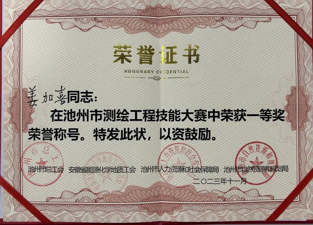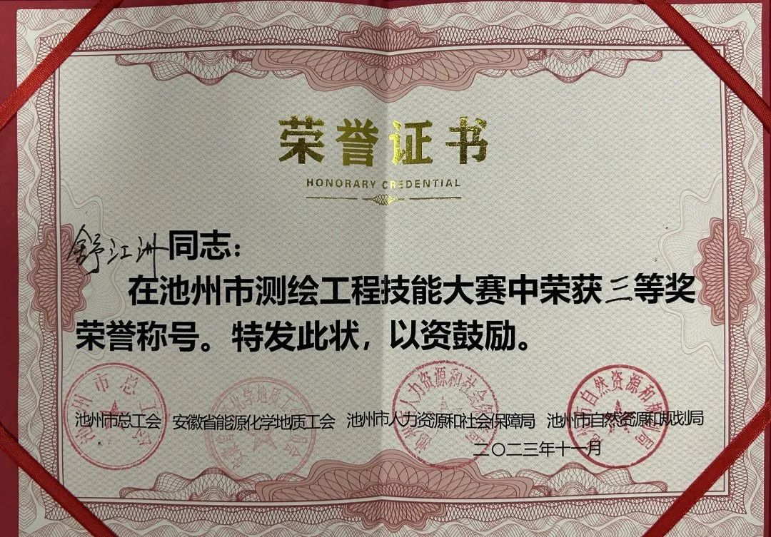 大賽設(shè)置了理論知識測試、團(tuán)體技能操作和個人技能操作三個環(huán)節(jié)。設(shè)計(jì)總院5名職工參賽,參賽選手們先后完成了GNSS-RTK施工放樣、1:500數(shù)字地形圖測繪、四等水準(zhǔn)測量、測繪理論知識等多個項(xiàng)目,積極將所學(xué)理論知識轉(zhuǎn)化為實(shí)操技能,展現(xiàn)了良好的競技風(fēng)貌。經(jīng)過激烈地角逐,池州市規(guī)劃勘測設(shè)計(jì)總院有限公司榮獲團(tuán)體一等獎,所屬測繪分院職工姜加喜和舒江洲兩位同志分別獲得個人賽一等獎和三等獎。
