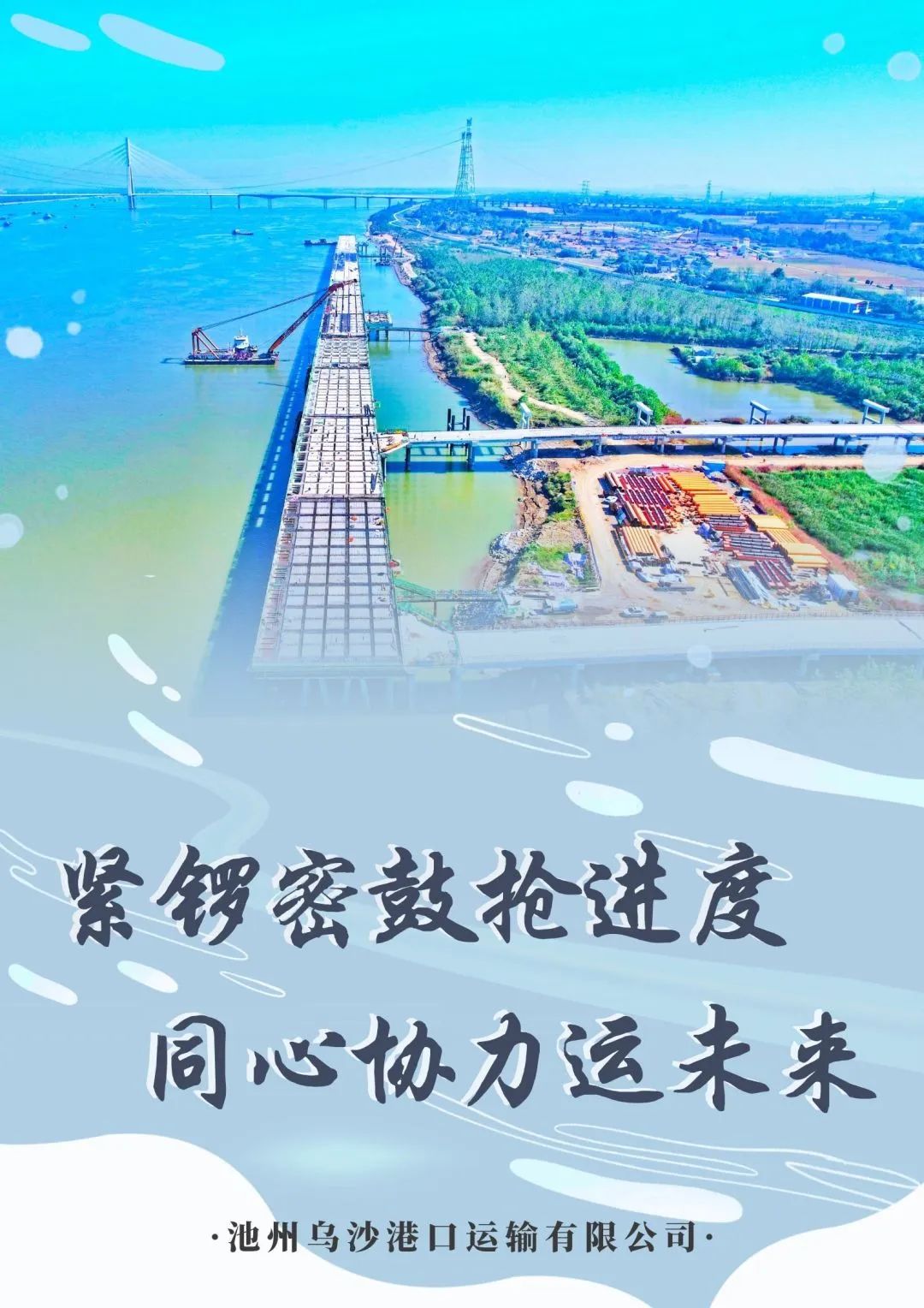 池州港烏沙港區(qū)公用碼頭項目系市投控集團重點投資項目,也是我市重大公用港口基礎(chǔ)設(shè)施建設(shè)項目,現(xiàn)在正處建設(shè)期。截至目前,水域部分(碼頭工程、引橋工程和防洪影響處理工程)已完成產(chǎn)值約2.4億元,陸域部分征遷工作已完成征遷總量的95%,設(shè)備采購、融資工作正有條不紊地推進中。下一步,池州烏沙港口運輸有限公司將錨定目標(biāo),緊扣節(jié)點,高質(zhì)高效如期完成烏沙港區(qū)公用碼頭項目建設(shè),為2024年預(yù)投產(chǎn)打下堅實基礎(chǔ)。