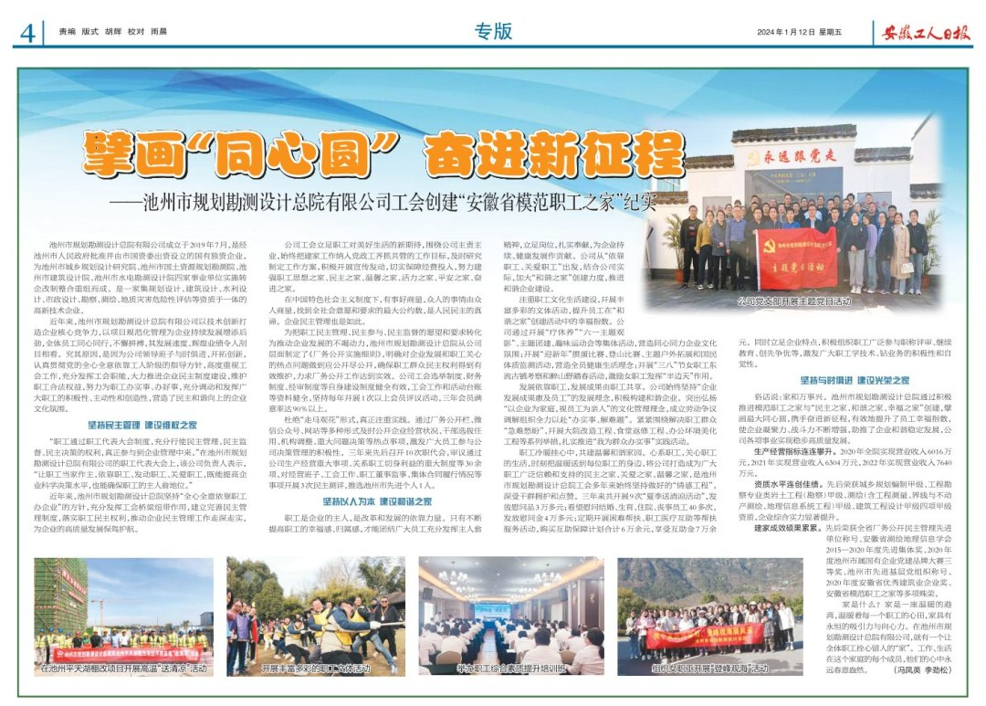 俗話說:家和萬事興。池州市規(guī)劃勘測設(shè)計(jì)總院通過積極推進(jìn)模范職工之家與“民主之家、和諧之家、幸福之家”創(chuàng)建,擘畫最大同心圓,攜手奮進(jìn)新征程,有效地提升了員工幸福指數(shù),使企業(yè)凝聚力、戰(zhàn)斗力不斷增強(qiáng),助推了企業(yè)和諧穩(wěn)定發(fā)展,公司各項(xiàng)事業(yè)實(shí)現(xiàn)穩(wěn)步高質(zhì)量發(fā)展。生產(chǎn)經(jīng)營指標(biāo)連連攀升。2020年全院實(shí)現(xiàn)營業(yè)收入6016萬元,2021年實(shí)現(xiàn)營業(yè)收入6304萬元,2022年實(shí)現(xiàn)營業(yè)收入7640萬元。資質(zhì)水平連創(chuàng)佳績。先后榮獲城鄉(xiāng)規(guī)劃編制甲級、工程勘察專業(yè)類巖土工程(勘察)甲級、測繪(含工程測量、界線與不動產(chǎn)測繪、地理信息系統(tǒng)工程)甲級、建筑工程設(shè)計(jì)甲級四項(xiàng)甲級資質(zhì),企業(yè)綜合實(shí)力顯著提升。建家成效碩果累累。先后榮獲全省廠務(wù)公開民主管理先進(jìn)單位、安徽省測繪地理信息學(xué)會2015—2020年度先進(jìn)集體獎;2020年度池州市屬國有企業(yè)黨建品牌大賽三等獎;池州市先進(jìn)基層黨組織稱號;2020年度安徽省優(yōu)秀建筑業(yè)企業(yè)獎;安徽省模范職工之家等多項(xiàng)殊榮。