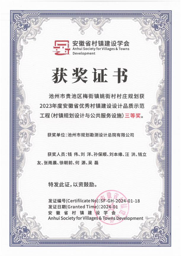 近日,安徽省村鎮(zhèn)建設(shè)學(xué)會和安徽省城市規(guī)劃學(xué)會分別揭曉了2023年度安徽省優(yōu)秀村鎮(zhèn)建設(shè)設(shè)計品質(zhì)示范工程和2023年度安徽省推薦優(yōu)秀城市規(guī)劃設(shè)計獎的獲獎名單。由集團(tuán)所屬設(shè)計總院公司編制完成的《池州市貴池區(qū)梅街鎮(zhèn)姚街村村莊規(guī)劃》和《池州市濱江區(qū)域生態(tài)修復(fù)規(guī)劃暨重點區(qū)域詳細(xì)規(guī)劃》兩個項目分別榮獲2023年度安徽省優(yōu)秀村鎮(zhèn)建設(shè)設(shè)計品質(zhì)示范工程(村鎮(zhèn)規(guī)劃設(shè)計與公共服務(wù)設(shè)施)三等獎和2023年度安徽省推薦優(yōu)秀城市規(guī)劃設(shè)計獎三等獎。