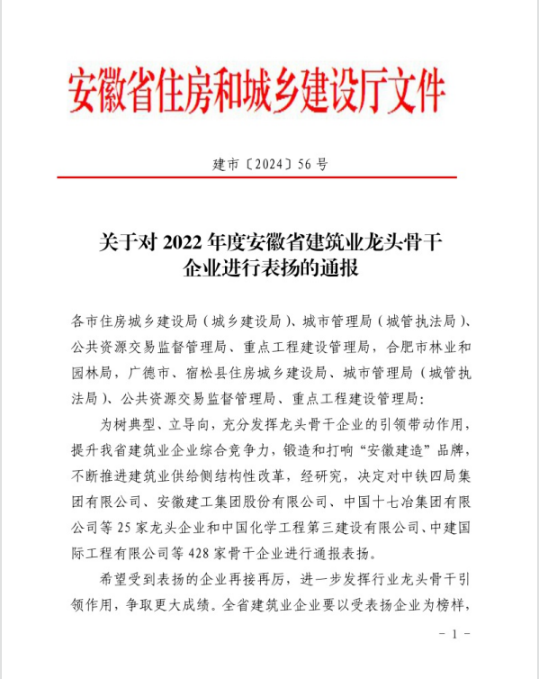 4月10日,安徽省住房和城鄉(xiāng)建設(shè)廳發(fā)布了《關(guān)于對2022年度安徽省建筑業(yè)龍頭骨干企業(yè)進(jìn)行表揚(yáng)的通報(bào)》,集團(tuán)所屬池州市規(guī)劃勘測設(shè)計(jì)總院有限公司榮登榜單。