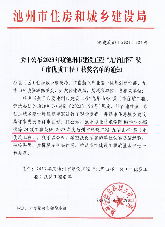 近日,池州市住房和城鄉(xiāng)建設(shè)局印發(fā)了《關(guān)于公布2023年度池州市建設(shè)工程“九華山杯”獎(jiǎng)(市優(yōu)質(zhì)工程)獲獎(jiǎng)名單的通知》(池建質(zhì)函〔2024〕224號(hào)),由池州建投集團(tuán)承建的池州職業(yè)技術(shù)學(xué)院8#學(xué)生公寓樓項(xiàng)目喜獲2023年度池州市建設(shè)工程“九華山杯”(市優(yōu)質(zhì)工程)獎(jiǎng)。